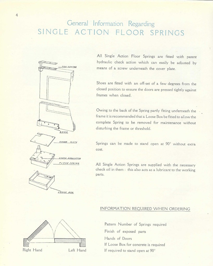 Most of the doors that were required to stay open were specified with ‘Lion single action floor springs’. A hydraulic check mechanism was fitted within the unit to ensure these doors opened in one direction only, that operational limits (up to a maximum of 90 degrees from its fixed pivot point) were not exceeded and quick alterations could be made with the use of a simple screwdriver. The shoe size however meant the door frame and other necessary partitions often had to be routed to enable the metalwork a flush recess that in turn provide a full closure.